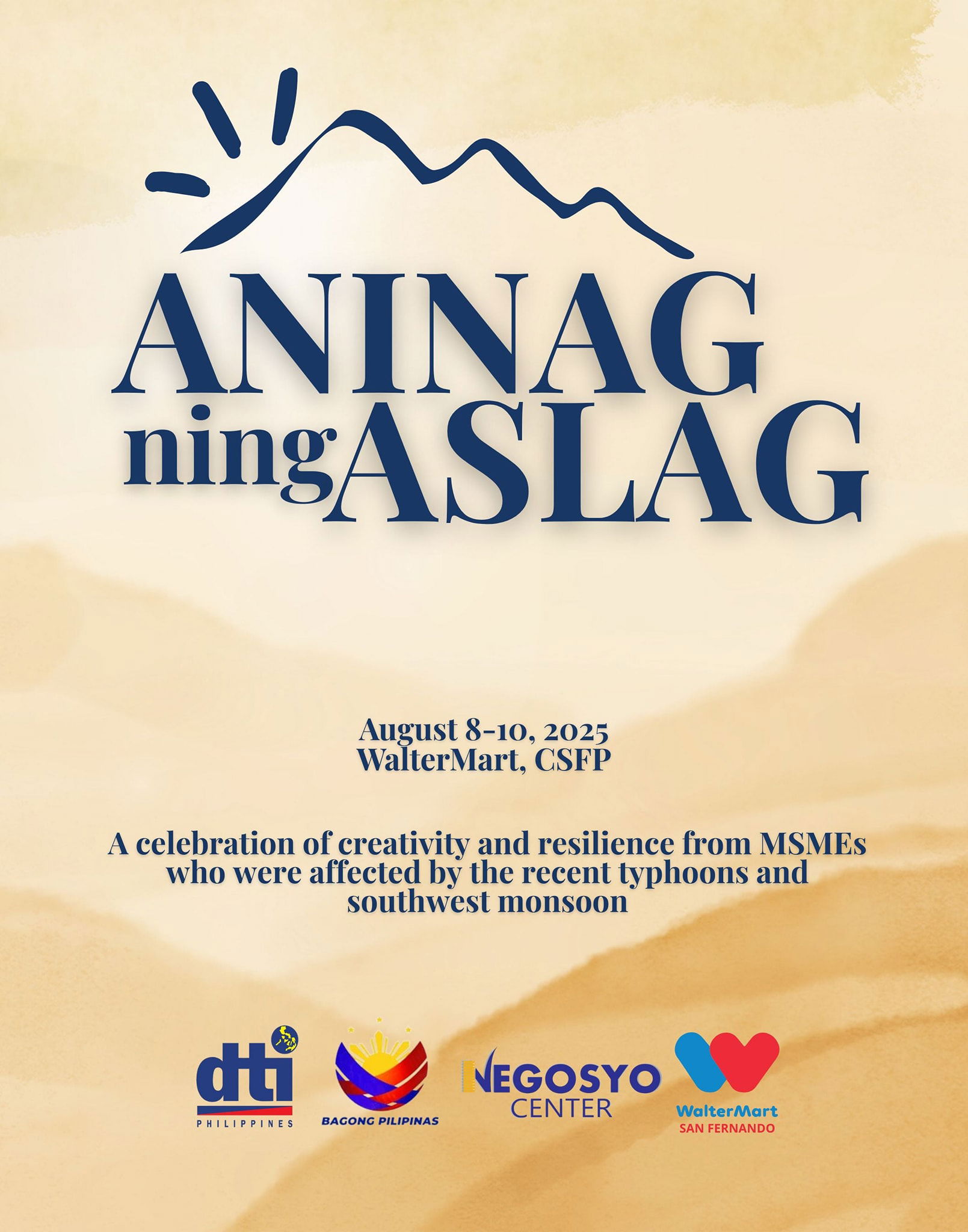 Experience the brilliance of local creativity and resilience at the Aninag ning Aslag Trade Fair August 8–10, 2025 WalterMart, City of San Fernando, PampangaJoin us for a 3-day celebration of proudly Kapampangan products, handcrafted goods, local delicacies, and inspiring stories from MSMEs who continue to rise and shine after Typhoon Crising and Habagat.Let’s support homegrown brands and ignite brighter beginnings together.